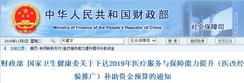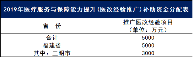 就在10月,財政部、國家衛健委剛下達《2019年醫療服務與保障能力提升(醫改經驗推廣)補助資金預算的通知 》,明確撥款5000萬元,支持福建省和三明市用于持續完善醫改政策,總結提煉醫改經驗,面向全國開展醫改工作培訓,大力向其他地區宣傳和推廣醫改經驗等工作。